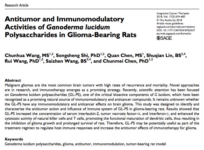 [Source] Wang C, et al. Antitumor and Immunomodulatory Activities of Ganoderma lucidum Polysaccharides in Glioma-Bearing Rats. Integr Cancer Ther. 2018 Sep;17(3):674-683.