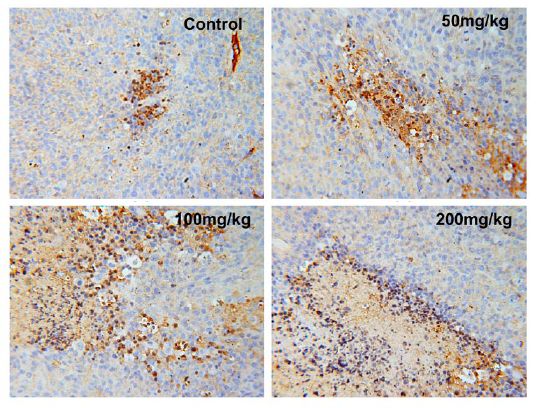 [Description] This is a tissue section of a rat brain tumor, in which the brown part is cytotoxic T-cells. Control refers to the control group, and the other three groups are GL-PS groups. The indicated data is the dose of Ganoderma lucidum polysaccharides injected into the intraperitoneal cavity of tumor-bearing rats.