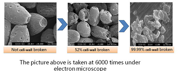 Since the surface of the ganoderma spore has a double-layered hard shell, the active ingredients contained in the spore are wrapped inside and cannot be easily absorbed by the body. At present, there are several technologies of breaking the cell wall of ganoderma spore including bio-enzymatic, chemical and physical methods. The method with better results is low-temperature physical cell-wall breaking technology adopted by our company. It can achieve over 99% cell-wall breaking rate, which substantially enables the body to absorb and utilize the active ingredients of the spores.