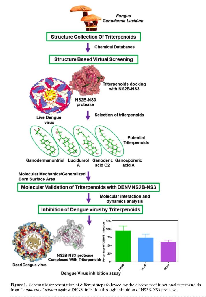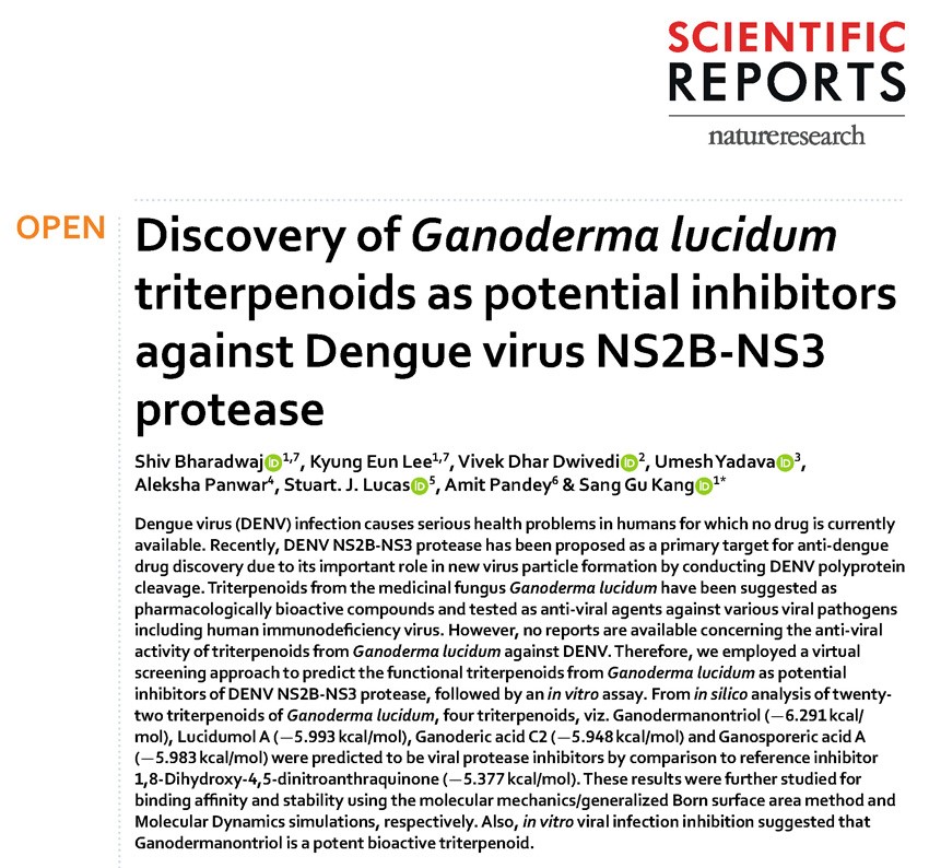 [Source] Bharadwaj S, et al. Discovery of Ganoderma lucidum triterpenoids as potential inhibitors against Dengue virus NS2B-NS3 protease. Sci Rep. 2019 Dec 13;9(1):19059. doi: 10.1038/s41598-019-55723-5.