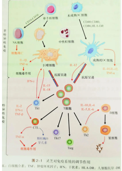 Ganoderma lucidum and its various active components affect many aspects of the immune system and immune response by affecting the function of immune cells and the process of immune response to varying degrees. The pharmacological effects of Ganoderma lucidum in anti-tumor, anti-radiotherapy damage, anti-chemotherapy damage, liver protection, anti-asthma, anti-aging and other aspects are closely related to its immune regulation function.
