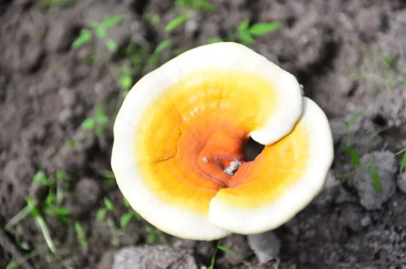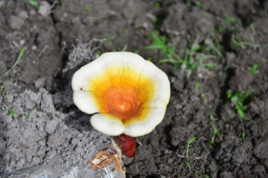 Look. In this organic Reishi base, the newly sprouted baby Ganoderma lucidum was presenting the color of half bright yellow and half white and remained different gestures! It was great fun.