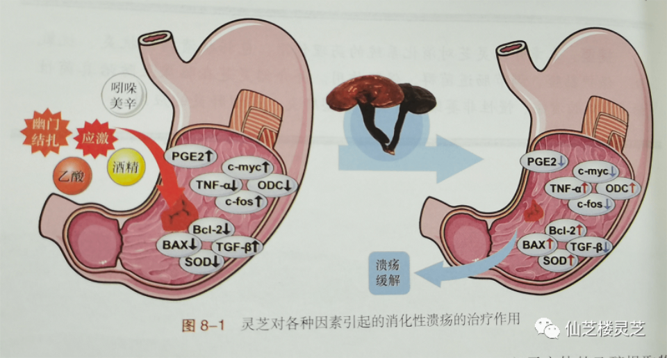 Studies have shown that the ethanol extract of Ganoderma lucidum fruiting bodies can improve the symptoms of gastric ulcer in SD rats induced by alcohol every other day, reduce gastric mucosal damage index, and inhibit mucosal damage and local congestion. The treatment of Ganoderma lucidum ethanol extract significantly increased the activity of SOD enzyme in rats, significantly decreased the apoptotic protein Bax, and increased the levels of TGF-B and anti-apoptotic proteins. In addition, Ganoderma lucidum cell-wall broken spore powder and Ganoderma tsugae fermented products also have a significant effect on gastric ulcers caused by alcohol.