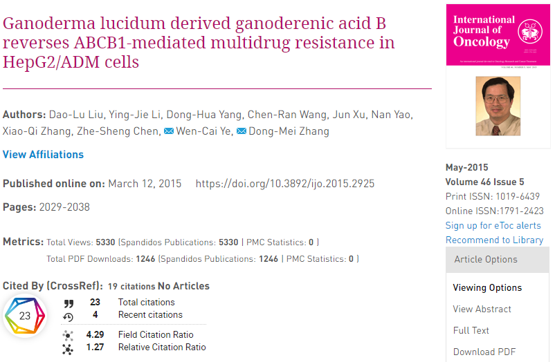 [Source] Liu DL, et al. Ganoderma lucidu derived ganoderenic acid B reverses ABCB1-mediated multidrug resistance in HepG2/ADM cells. Int J Oncol. 46(5):2029-38. doi: 10.3892/ijo.2015.2925.