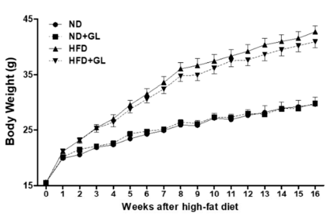 The experimental mice were divided into four groups: normal diet (ND), normal diet (ND) + Ganoderma lucidum (GL), high-fat diet (HFD), high-fat diet (HFD) + Ganoderma lucidum (GL). In the feed of the normal diet group, fat accounted for 6% of the total calories; in the feed of the high-fat diet, fat accounted for 45% of the total calories, which was 7.5 times of the former. The Ganoderma lucidum fed to mice is actually an ethanol extract of the fruiting body of Ganoderma lucidum. The researchers fed the mice at a dose of 50 mg/kg Ganoderma lucidum ethanol extract per day for five days a week.