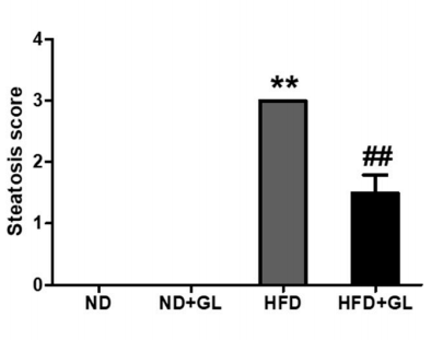 The fat in liver tissues of mice in each group was quantified into Figure 4, and it could be seen that fatty liver in the high-fat diet group reached grade 3 (the fat content was more than 66% of the weight of the whole liver, indicating severe fatty liver). At the same time, the fat content in the liver of HFD-fed mice that ate Ganoderma lucidum was reduced by half.