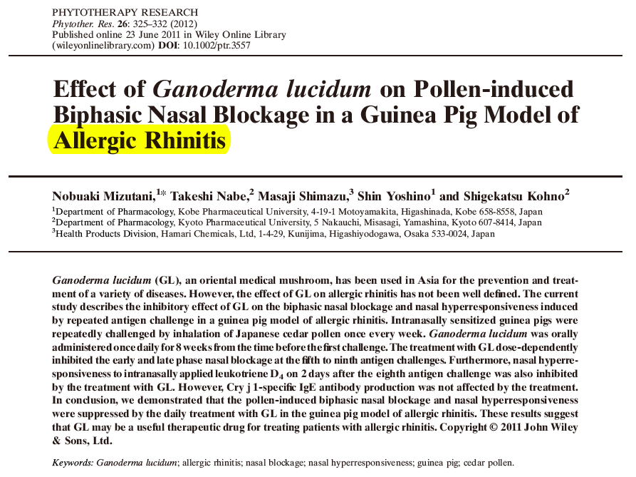 [Source] Mizutani N, et al. Effect of Ganoderma lucidum on pollen-induced biphasic nasal blockage in a guinea pig model of allergic rhinitis. Phytother Res. 2012 Mar;26(3):325-32. doi: 10.1002/ptr.3557. Epub 2011 Jun 23.
