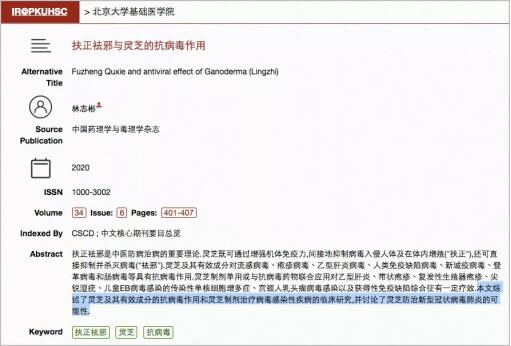 June 2020-”Chinese Journal of Pharmacology and Toxicology”: Effect of Ganoderma lucidum in strengthening vital energy and eliminating pathogenic factors and its antiviral effect