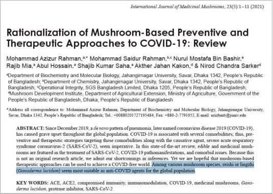 4. Mohammad Azizur Rahman, et al. Rationalization of Mushroom-Based Preventive and Therapeutic Approaches to COVID-19: Review. Int J Med Mushrooms. 2021;23(5):1-11. doi: 10.1615/IntJMedMushrooms.2021038285.