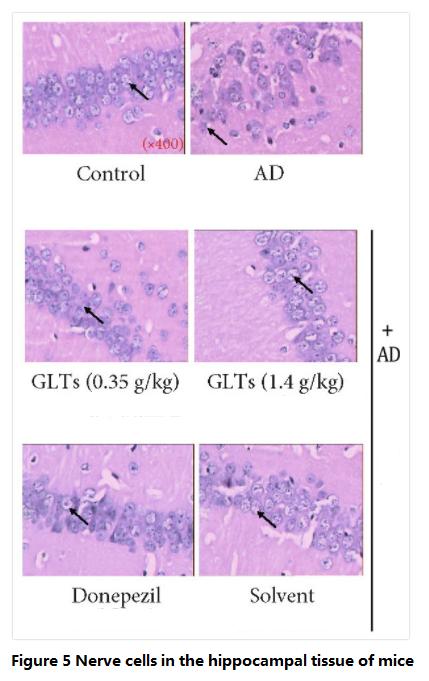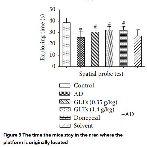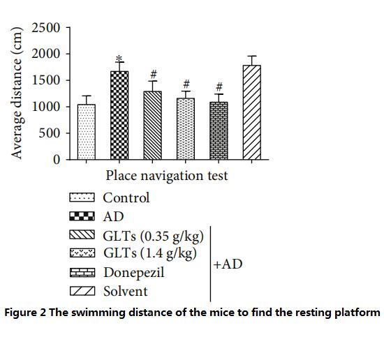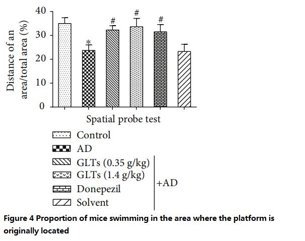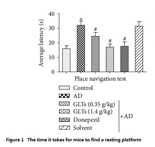 However, AD mice fed with high doses (1.4g/kg per day) of GLTs took almost the same time and swimming distance to find the resting platform as the normal mice and the AD mice (Western medicine control group) fed with donepezil every day (Figure 1~2).