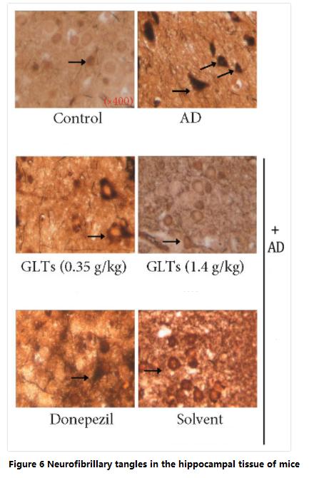 At the same time, the researchers also found that the number of neurofibrillary tangles in the cerebral cortex (storing long-term memory) and hippocampal gyrus tissue in AD mice protected by Ganoderma lucidum triterpenoids was significantly lower than that in untreated AD mice (Figure 6).
