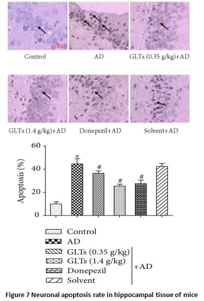 From the analysis of the hippocampal gyrus tissue of each group of experimental mice, it can be found that the death rate of nerve cells in AD mice is more than four times that of normal mice of the same age; although high-dose Ganoderma lucidum triterpenoids cannot completely prevent abnormal apoptosis of nerve cells, they have been able to halve the damage, and the effect is comparable to that of western medicine (Figure 7).