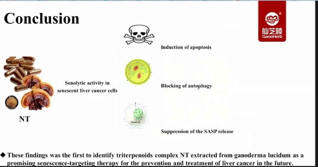 The study found that Ganoderma lucidum triterpenoid complex NT can reduce the proportion of senescent liver cancer cells and induce apoptosis of senescent liver cancer cells. It can eliminate senescent liver cancer cells and inhibit SASP in senescent liver cancer cells by inhibiting NF-κB, TFEB, P38, ERK and mTOR signaling pathways, especially the inhibition of IL-6, IL-1β and IL-1α.