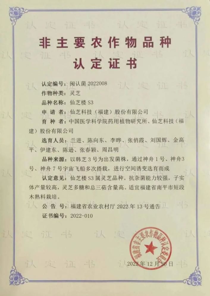 Recently, Fujian Provincial Non-Major Crop Variety Identification Committee announced the catalog of 15 non-main crop varieties approved by Fujian Province in 2022. GanoHerb S3, a new variety of Reishi mushroom applied by GanoHerb Technology (Fujian) Corporation, a subsidiary of GanoHerb Group, is among them.