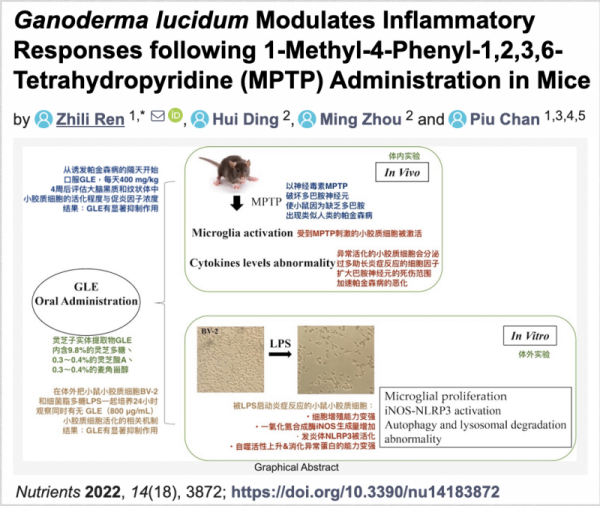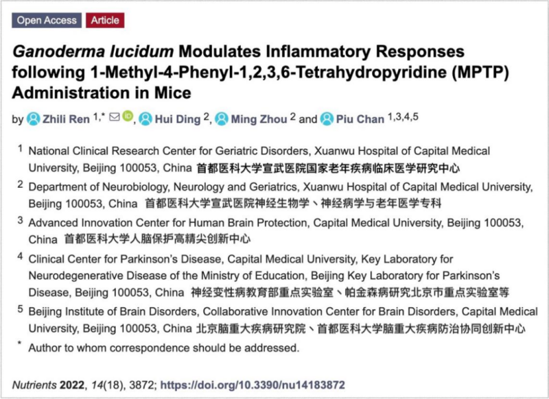 1. Zhili Ren, et al. Ganoderma lucidum Modulates Inflammatory Responses following 1-Methyl-4-Phenyl-1,2,3,6-Tetrahydropyridine (MPTP) Administration in Mice. Nutrients. 2022;14(18):3872. doi: 10.3390/nu14183872.