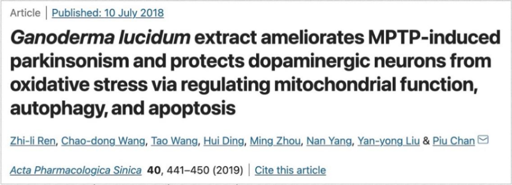 2. Zhi-Li Ren, et al. Ganoderma lucidum Extract Ameliorates MPTP-Induced Parkinsonism and Protects Dopaminergic Neurons from Oxidative Stress via Regulating Mitochondrial Function, Autophagy, and Apoptosis. Acta Pharmacol Sin. 2019;40(4):441-450. doi: 10.1038/s41401-018-0077-8.