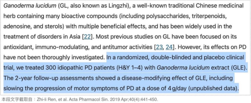 These patients ranged from stage 1 (“symptoms appear on one side of the body but do not affect balance”) to stage 4 (“severely impaired mobility but is able to walk and stand independently”). The researchers let the patients take 4 grams of Ganoderma lucidum extract orally every day for 2 years, and found that the patients’ “motor symptoms” can indeed be relieved by the intervention of Ganoderma lucidum.