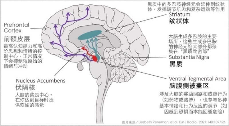 ▲The neurons that generate dopamine in the brain are located in the compact part of the “substantia nigra”. The dopamine generated here will be sent to various regions of the brain to play a role along with the extended antennae of the dopamine neurons. The typical movement disorder of Parkinson’s disease is mainly due to the lack of dopamine transported from the substantia nigra to the striatum. Therefore, whether it is dopamine neurons located in the substantia nigra or tentacles of dopamine neurons extending to the striatum, their number and surrounding environment are critical to the progression of Parkinson’s disease.
