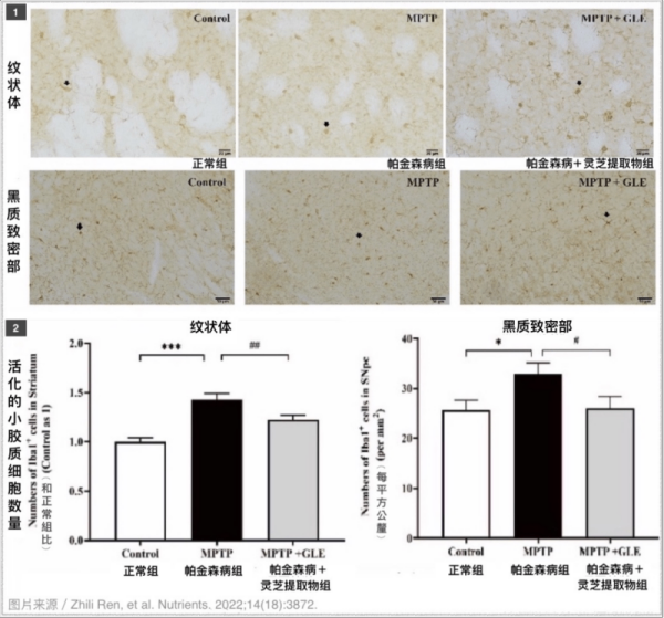 After 4 weeks, a large number of activated microglia appeared in the striatum and substantia nigra pars compacta (the main distribution area of dopamine neurons) in the brain of mice with Parkinson’s disease, but this did not happen in the mice with Parkinson’s disease who ate Ganoderma lucidum extract every day – their condition is closer to that of normal mice (pictured below).