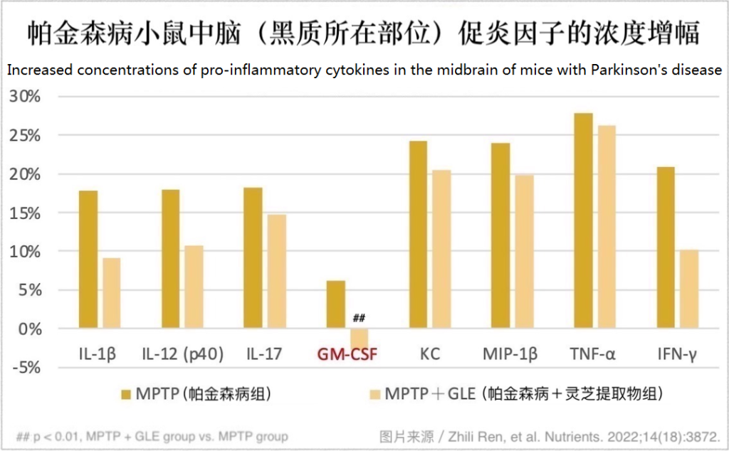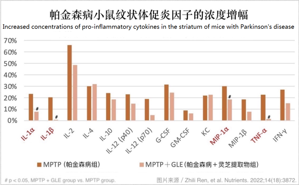 Activated microglia cells secrete a variety of cytokines or chemokines to promote inflammation and aggravate the damage of dopamine neurons. However, in the detection of the midbrain and striatum of the above-mentioned experimental animals, the researchers found that daily consumption of Ganoderma lucidum extract can inhibit the production of pro-inflammatory cytokines that are significantly increased due to the onset of Parkinson’s disease (as shown in the figure below).