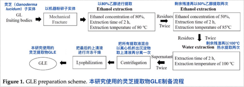 The Ganoderma lucidum extract GLE used in this research is made from the fruiting bodies of Ganoderma lucidum through multiple ethanol and hot water extraction processes. It contains about 9.8% Ganoderma lucidum polysaccharides, 0.3-0.4% ganoderic acid A (one of the most important triterpenoids in Ganoderma lucidum fruiting bodies) and 0.3-0.4% ergosterol.