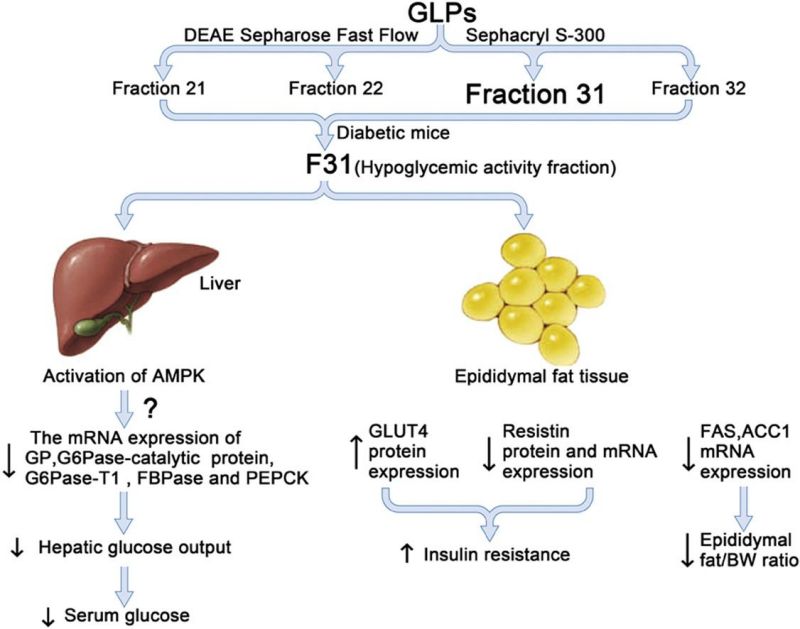 Now, they have further isolated four polysaccharides from GLPs, and took the more active F31 (molecular weight of about 15.9 kDa, containing 15.1% protein) for in-depth study, and found that it can not only regulate blood glucose through multiple pathways but also protect the liver.