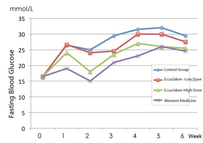 In a 6-week animal experiment, it was found that type 2 diabetic mice (Ganoderma lucidum group-high dose) fed with 50 mg/kg Ganoderma lucidum polysaccharides F31 every day had consistently lower fasting blood glucose levels than untreated diabetic mice (control group), and there were significant differences.