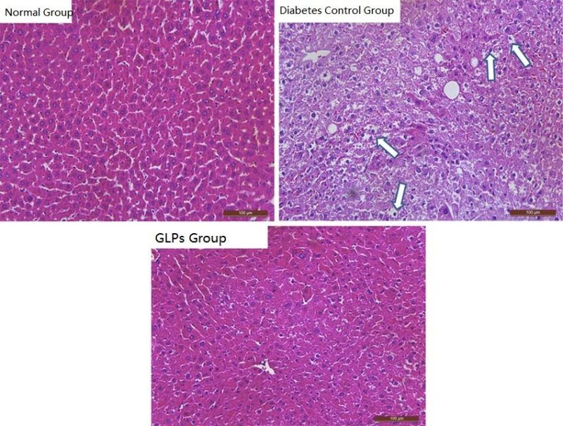 It can be seen from Figure 2, during the experiment, the structure and morphology of liver tissue of diabetic mice protected by Ganoderma lucidum polysaccharides F31 (50 mg/kg) were similar to that of normal mice, and there was less inflammation. In contrast, the liver tissues of diabetic mice that did not receive any treatment were significantly damaged, and the conditions of inflammation and necrosis were also more serious.