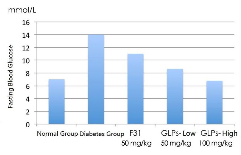 In contrast, the diabetic mice (Ganoderma lucidum group-low dose) that also ate Ganoderma lucidum polysaccharides F31 daily but at a dose of only 25 mg/kg had a less obvious drop in blood glucose. This shows that the Ganoderma lucidum polysaccharides have the effect of regulating blood glucose, but the effect will be affected by the dosage (Figure 1).