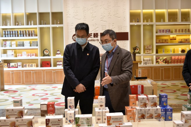After a series of strict safety and epidemic prevention procedures such as temperature measurement and hand washing and disinfection, accompanied by Chairman Li Ye of the Group, Secretary Huang Jianxiong and his team visited the Lingzhi Cultural Exhibition Hall of GanoHerb to understand the situation of employees resuming work and production, to listen to President Li Ye’s report on the company’s development history, scientific research and production, market sales, development planning and current problems and to give solutions on the spot.