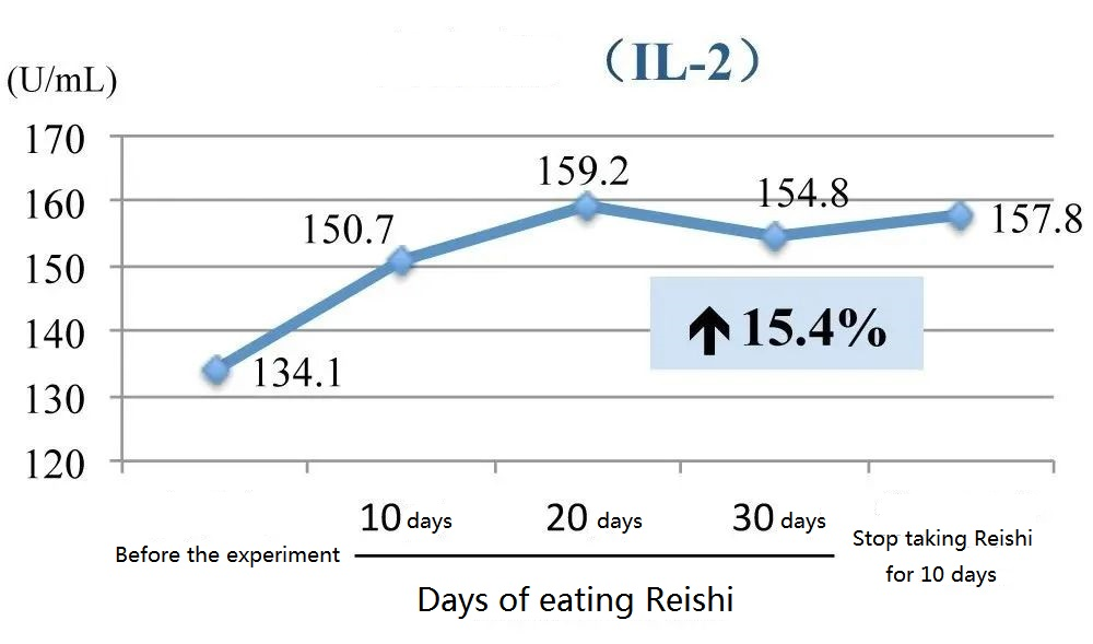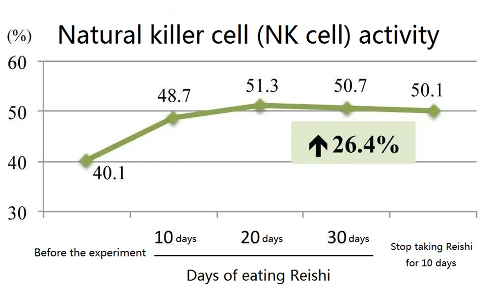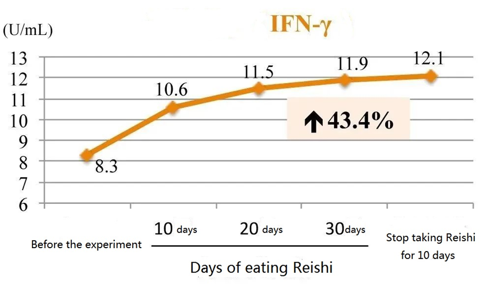 For the elderly with an average age of 65 years old suffering from hyperlipidemia or cardiocerebral atherosclerosis, after taking 30 days of Reishi powder (4.5 grams per day), the activity of natural killer cells and the concentrations of IFN-γ and IL-2 in the blood were significantly improved, and the effect persisted even after Reishi mushroom was discontinued for 10 days (Figure 1).