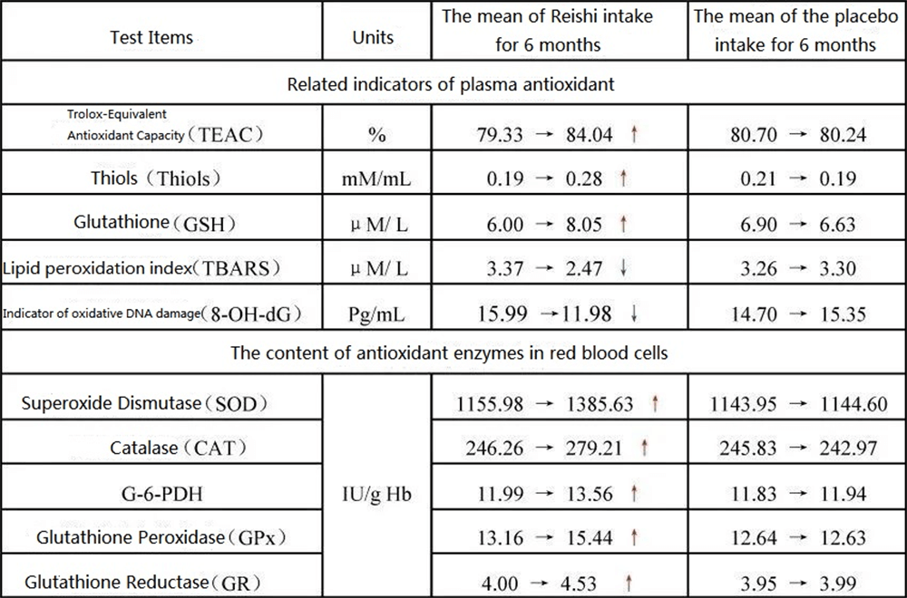 The Reishi mushroom group took 225 mg of Reishi mushroom fruiting body extract preparation every day. After 6 months, the various antioxidant indicators of the subjects increased (Table 1) while their liver function improved—the average values of AST and ALT decreased by 42% and 27% respectively. Instead, the placebo group underwent “no significant difference” compared to before.