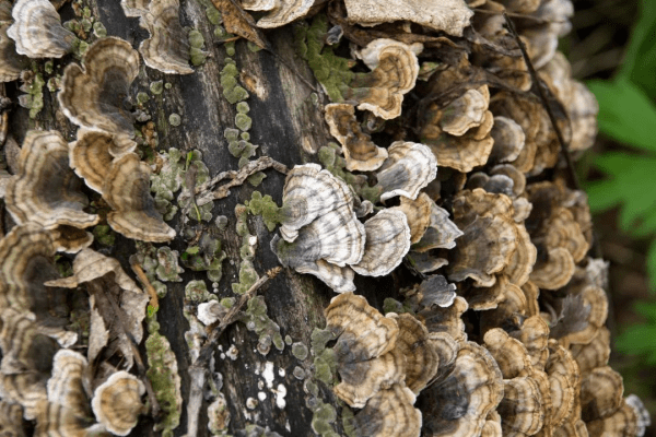Coriolus versicolor, this kind of fungus looks like a turkey’s tail. Its cap is semicircular to shell-shaped. It is a common large-scale fungus, mainly wild. It grows on various broad-leaved tree stumps, fallen logs and branches.