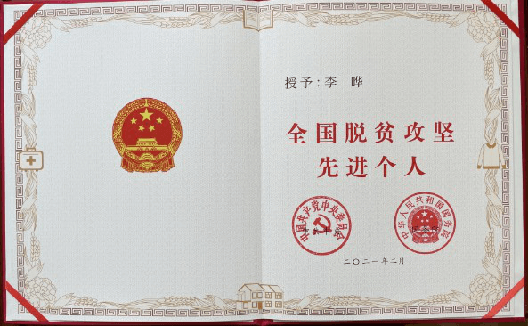 Honorary Certificate of National Advanced Individual for Poverty Alleviation