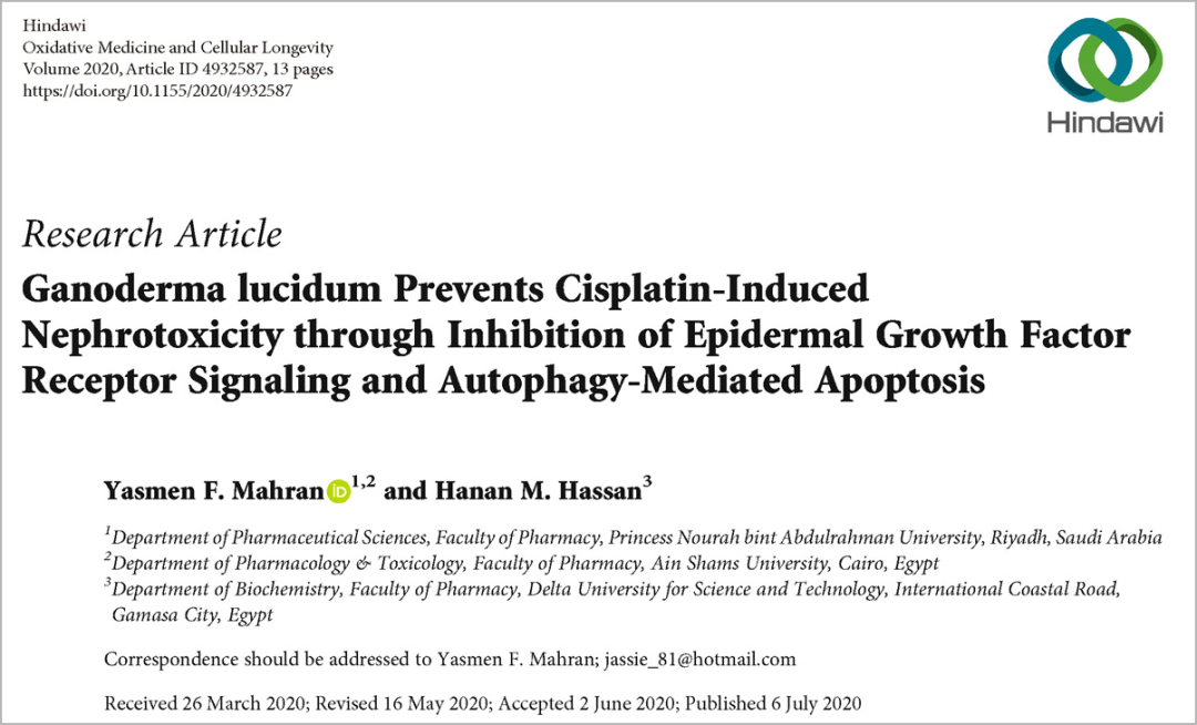 1. Yasmen F Mahran, et al. Ganoderma lucidum Prevents Cisplatin-Induced Nephrotoxicity through Inhibition of Epidermal Growth Factor Receptor Signaling and Autophagy-Mediated Apoptosis. Oxid Med Cell Longev. 2020. doi: 10.1155/2020/4932587.