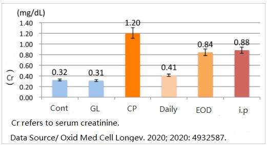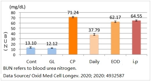 After the 10-day experiment, blood was drawn to detect the creatinine and blood urea nitrogen content of rats in each group. The results found that cisplatin increased these two indexes sharply, which means that the kidney tissue was seriously injured; if Ganoderma lucidum is used at the same time, the increase of these two indicators will be much reduced, especially eating Ganoderma lucidum every day produces a more obvious protective effect (Fig.