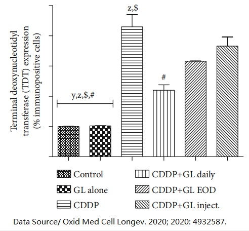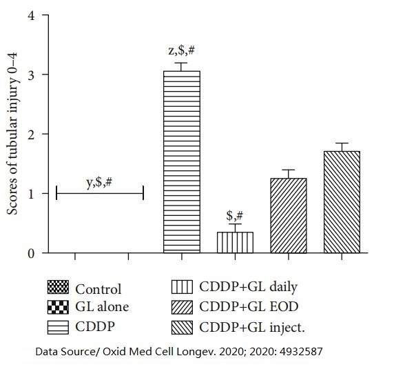 Since cisplatin accumulates in the epithelial cells of the renal tubules in large quantities, the injury of the renal tubules naturally becomes the main observation target. It can be clearly seen from the quantified degree of renal tubular injury that Ganoderma lucidum can significantly reduce the renal tubular injury caused by cisplatin. In particular, eating Ganoderma lucidum every day produces the most significant protective effect.