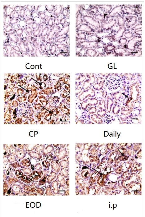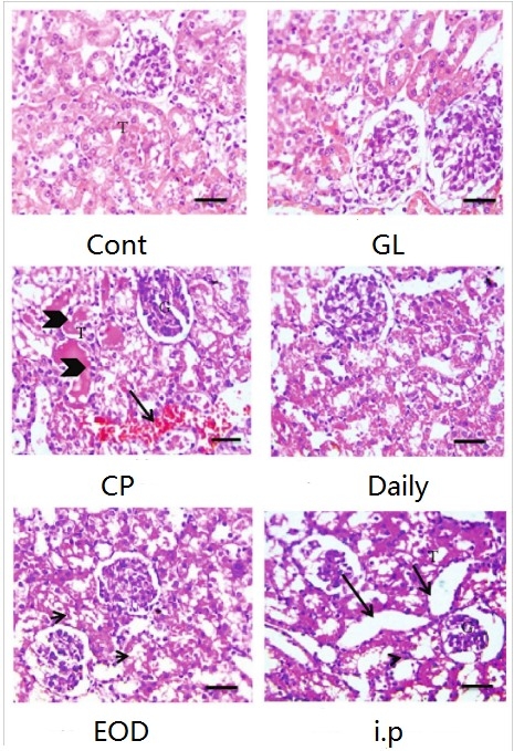 The same results were also reflected in the stained sections of kidney tissues of rats in each group (Fig. 2). When cisplatin causes renal congestion, renal tubule dilatation, and necrosis, shedding, or vacuolar degeneration of renal tubular epithelial cells in rats (there are various arrows indicating injury on the stained section figure), the kidney tissues of the rats of the Everyday Group (Daily) suffered the least injury (there is no arrow representing injuries on the stained section figure).