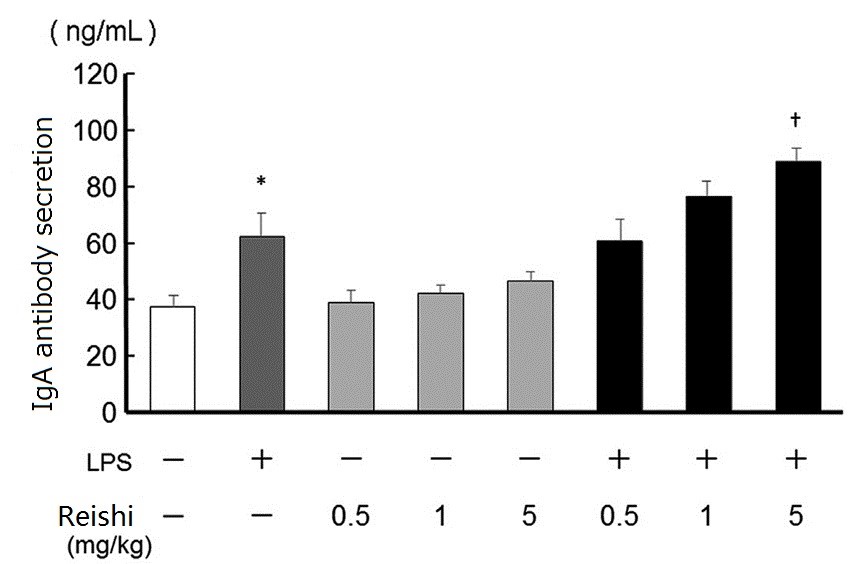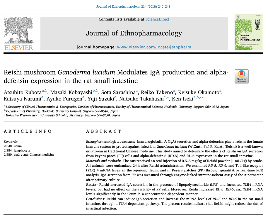 [Source] Kubota A, et al. Reishi mushroom Ganoderma lucidum modulates IgA production and alpha-defensin expression in the rat small intestine. J Ethnopharmacol. 2018 Mar 25;214:240-243.