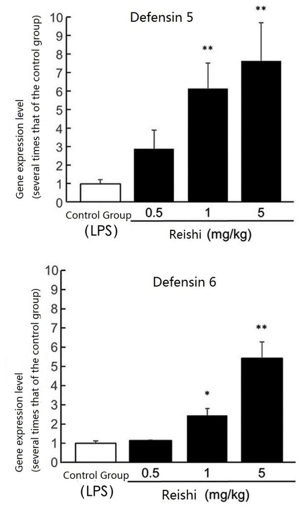 Paneth cells are mainly concentrated in the ileum (the second half of the small intestine). According to the animal experiment of the study, in the absence of LPS stimulation, rats were administered intragastrically Ganoderma lucidum (at the dose of 0.5, 1, 5 mg per kg body weight) for 24 hours, the gene expression levels of defensin-5 and defensin-6 in the ileum will increase with the increase of the Ganoderma lucidum dose, and are higher than the expression levels when stimulated by LPS (as shown in the figure below).