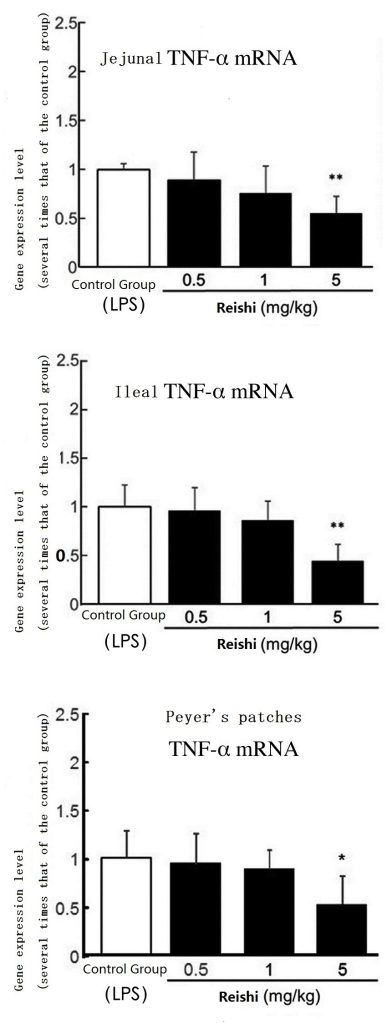 It was found that TNF-α expression and secretion levels in the anterior and posterior segments of the small intestine (jejunum and ileum) and in the Peyer’s patches on the intestinal wall of rats were not particularly increased when Ganoderma lucidum was administered (as shown in the figure below), and high doses of Ganoderma lucidum could even inhibit TNF-α.