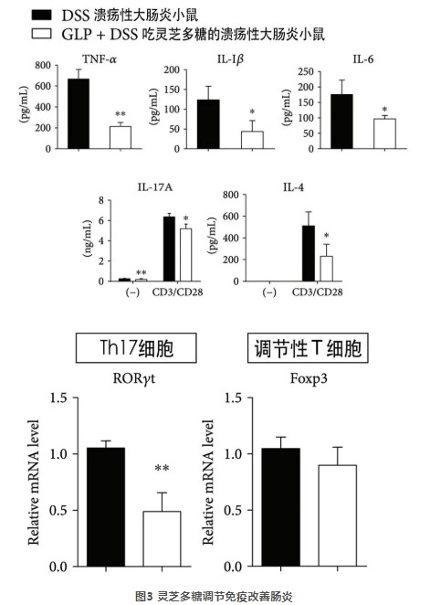 The imbalance of these two groups of cells is considered to be the key to detonating ulcerative colitis. In the above-mentioned study of China Medical University, although the regulatory T cells in the mucosal tissues of the mouse large intestine were not increased by the intervention of Ganoderma lucidum polysaccharides, the secretion of Th17 cells and IL-17A has been significantly reduced (Figure 3), which should be a good start for the balance between Th17 cells and regulatory T cells.