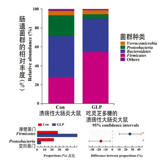 The mice were fed with Ganoderma lucidum polysaccharides for 3 weeks (393.75 mg/kg per day) and was then induced an acute attack of ulcerative colitis. Their inflamed intestines usually have the phenomenon of increased Proteobacteria flora, decreased Firmicutes flora, and decreased short-chain fatty acid secretion. However, in the large intestine protected by Ganoderma lucidum polysaccharides, the two major floras have experienced significant growth and decline, and the content of short-chain fatty acids has also risen sharply. (Source/Reference 2)