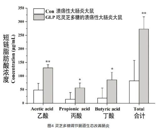 Research from Jinan University found that Ganoderma lucidum polysaccharides can adjust the ratio of the intestinal flora of experimental rats (such as reducing the pathogenic flora, increasing the flora that resists inflammation and secrets short-chain fatty acid), and promote the intestinal tract to secrete more short-chain fatty acids (Figure 4), which in turn regulates the immune response of the intestinal mucosa and reduces the severity of ulcerative colitis.