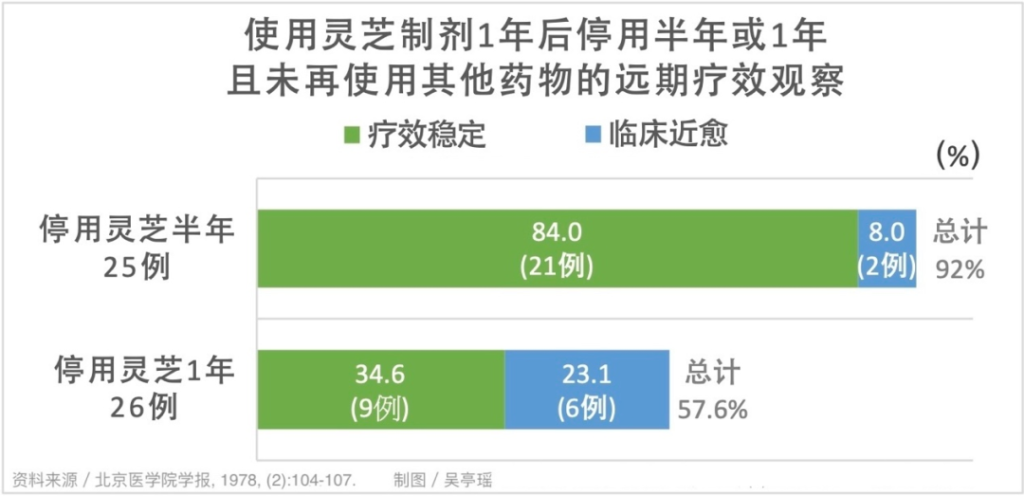 If Ganoderma is discontinued only after a year of use, then during the half-year to one-year period after discontinuation, even without taking other medications, there is more than a fifty percent chance of maintaining a “stable therapeutic effect” or a state of “near clinical cure”.