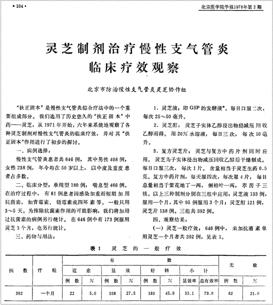 To do a good job, one must first sharpen one’s tools. In 1978, the Beijing Ganoderma Collaboration Group for the Prevention and Treatment of Chronic Bronchitis published “Clinical Efficacy Observation of Ganoderma Lucidum Preparations in the Treatment of Chronic Bronchitis” in the Journal of Beijing Medical University. The paper statistically analyzed the application results of three different Ganoderma preparations for more than 600 patients with chronic bronchitis. Its early publication time provided a wealth of knowledge base for how Ganoderma lucidum protects the bronchi in the human body. Its large-scale experiment and systematic exploration are unprecedented, making it an indispensable learning material for pragmatic learners of Ganoderma lucidum.