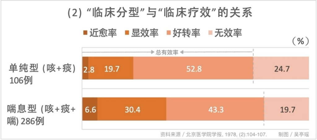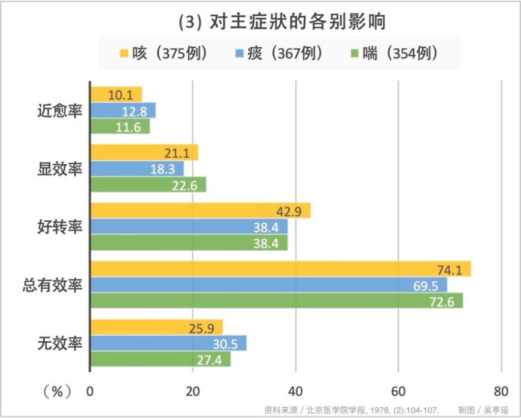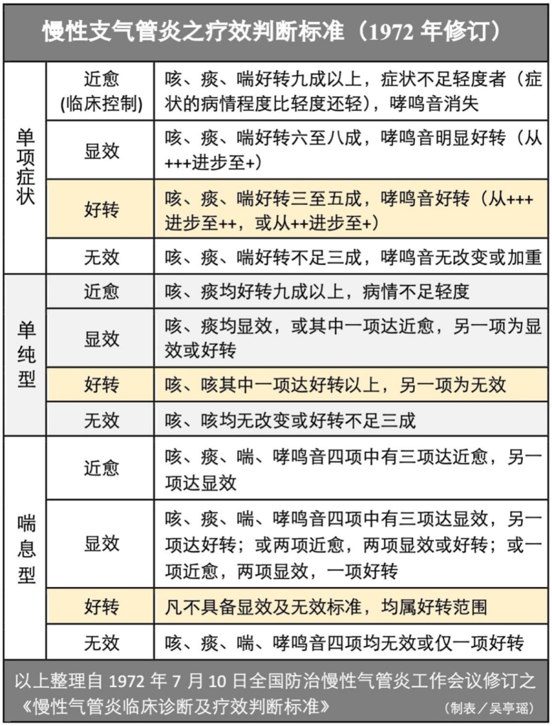 According to the standards for judging the long-term therapeutic effect on chronic bronchitis at that time, the so-called “stable therapeutic effect” refers to a relatively stable condition, with the number and severity of attacks reduced by more than 70 percent compared to the same period last year, and general conditions (including diet, sleep, physical strength, etc.) have significantly improved. As for “near clinical cure”, there is no definition, but it can be referred to the explanation of “clinical cure refers to a stable condition, with no recurrence observed in clinical control for more than one year”, with a slight discount.