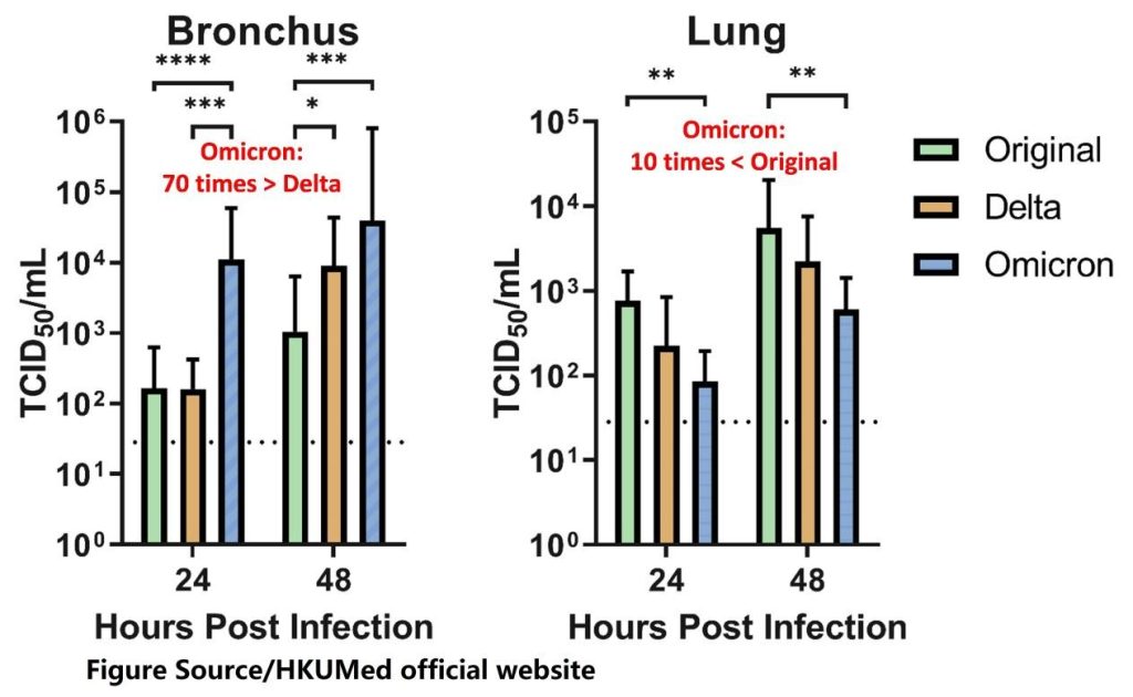 According to the research results published by HKUMed on its official website on December 15, the Omicron variant replicates around 70 times faster than Delta and the original Covid-19 strain in human bronchus but less well in human lung tissue.
