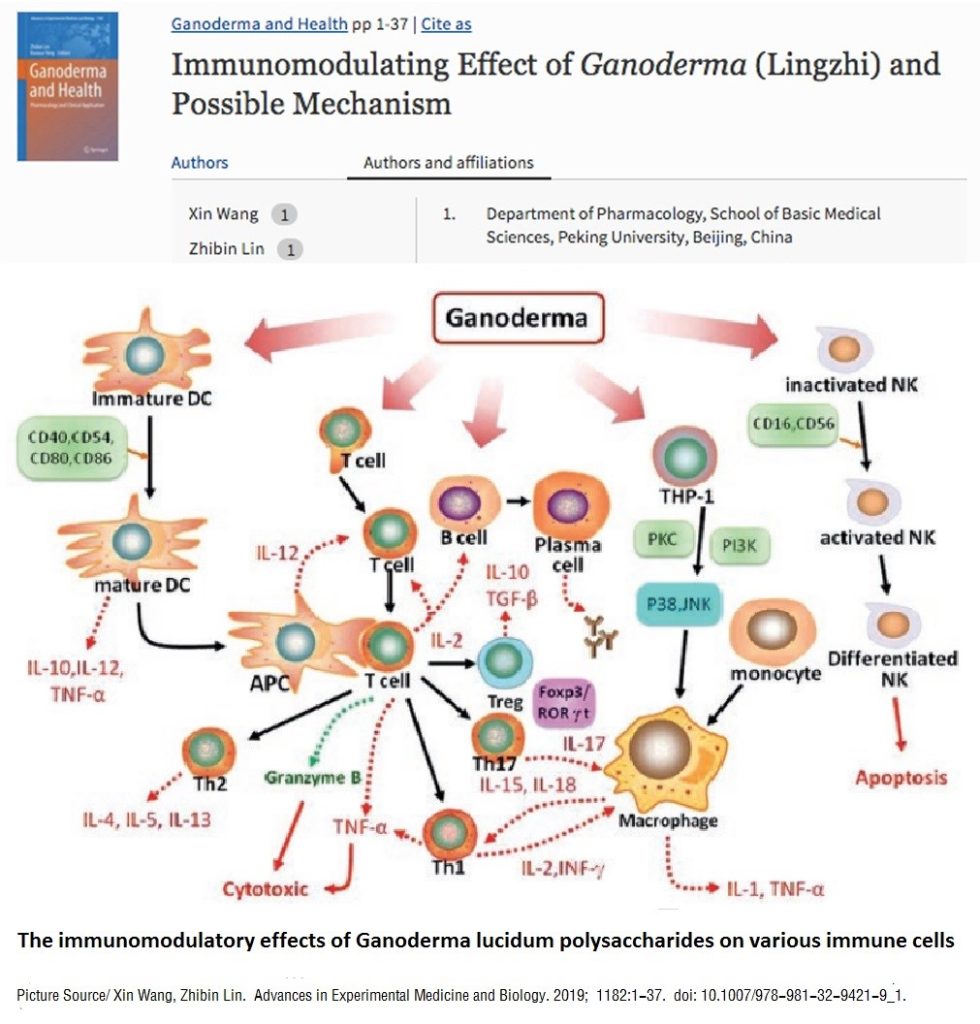 Since research in the 1990s, Ganoderma lucidum has been proven to accelerate the maturation of dendritic cells, regulate the differentiation of T cells, stimulate the production of antibodies by B cells, promote the differentiation of monocytes-macrophages, and enhance the activity of natural killer cells, help with the proliferation of various immune cells and the secretion of various cytokines, and have a comprehensive regulatory effect on the immune system. These effects are all summarized in the diagram below.