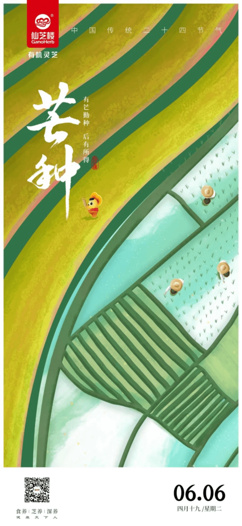 Grain in Ear is the ninth of the 24 solar terms and the third solar term of summer, indicating the beginning of midsummer. Grain in Ear, pronounced “Mang Zhong” in Chinese, literally means “awned wheat should be harvested quickly, awned rice can be planted”. “Mang” is homophonic to the word “busy” in Chinese, indicating that all crops are “busy planting”.